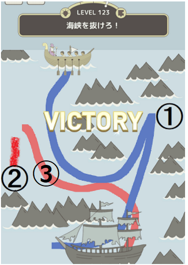 - 魔法使いの船は①の位置に移動して4秒ほど止まる。その後ゴールまで道筋を伸ばす(逆y字)。一方、幌船は②の場所に移動して3秒待つ。線が消えて元の場所に戻るので今度は幌船を下まで航路を作る。③の位置で止まり一呼吸して一気に下部まで動線を作る。暗記された航路が2隻同時に動くので2隻が交差するタイミングをコントロールする。2~3回失敗を経験にコツがつかめる。